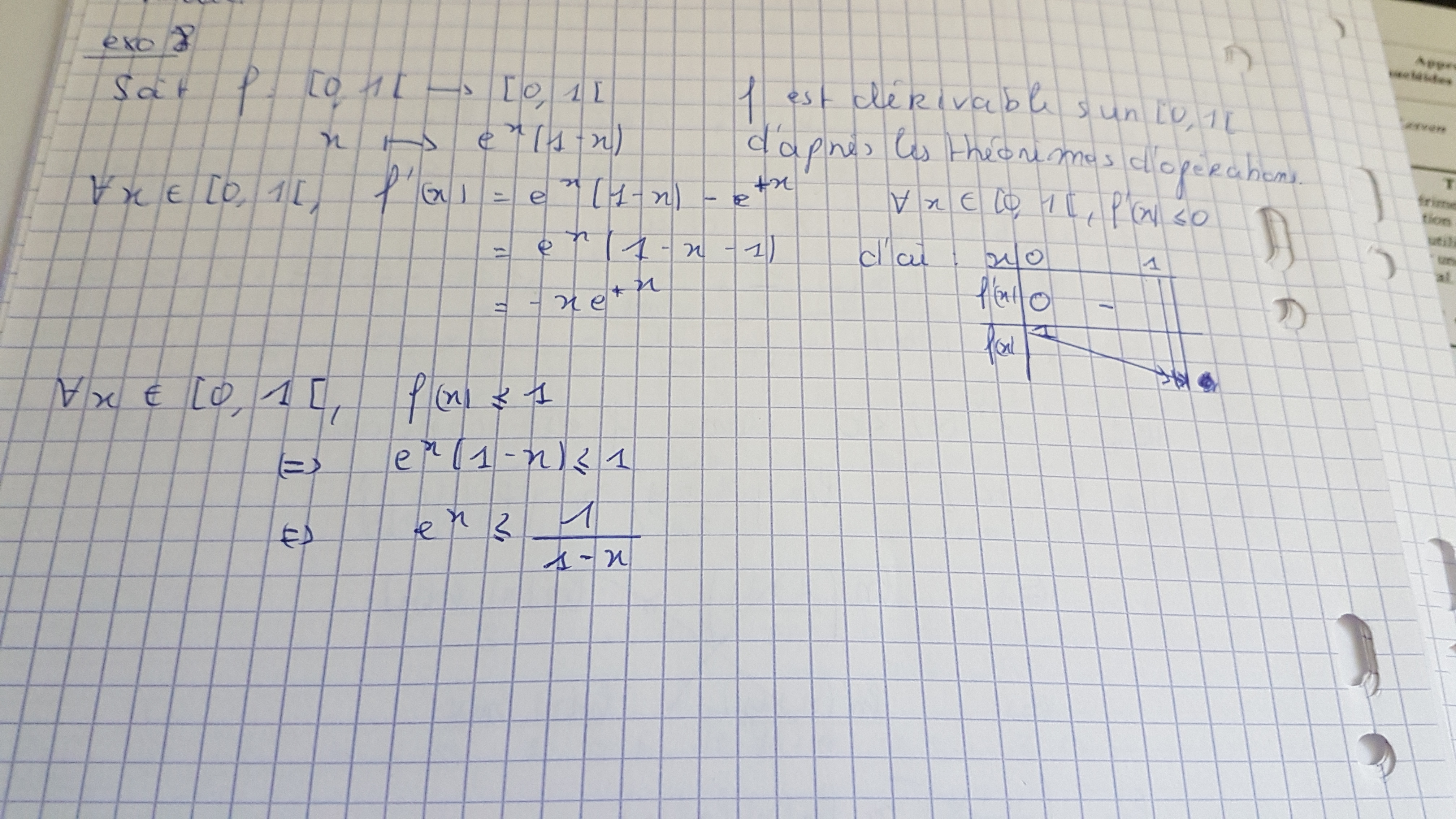Dire (par exemple dans la rédaction ci-dessous). Donc on a montré que pour tout x dans [0,1[ , f(x) <1
