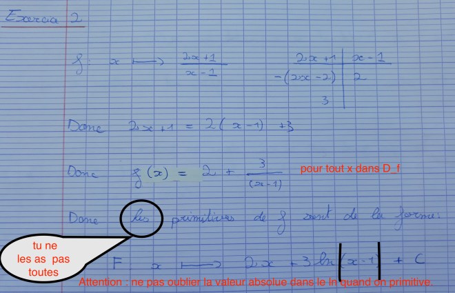 Voir mes annotations sur le manuscrit de l’ex.2 et le corrigé tapé en dessous où je donne TOUTES les primitives sur R privé de 1 qui n’est pas un INTERVALLE.