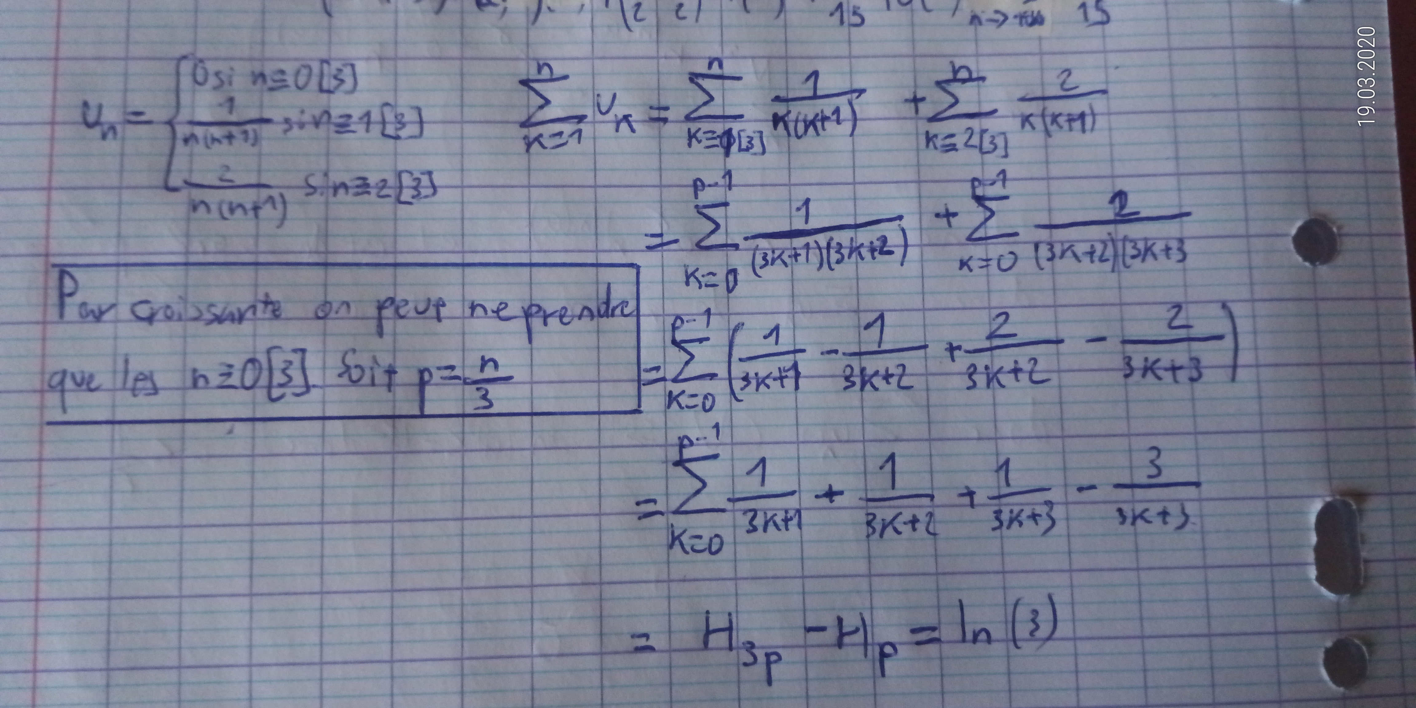 Solution d’Etienne ex. 8 pl. 36 N.B.Il manque seulement un o(1) à la dernière ligne H_{3n}-H_n=ln(3)+o(1). NB 2 noter bien qu’en effet il suffit de regarder les sommes partielles S_(3p) comme le dit Etienne dans l’encadré. Partager : Cliquer pour partager sur X(ouvre dans une nouvelle fenêtre) X Cliquez pour partager sur Facebook(ouvre dans une nouvelle fenêtre) Facebook J’aime chargement… Similaire