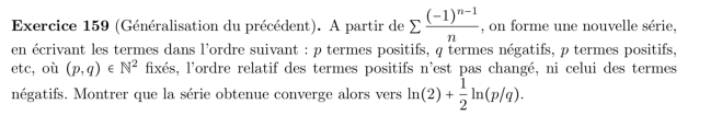 Généralisation pour pas beaucoup plus cher de l’ex 3 pl. 37 L’exercice de la planche (a) est le cas p=1, q=2 de l’exercice plus général suivant : On regarde bien sûr les sommes partielles d’indices n(p+q). Partager : Cliquer pour partager sur X(ouvre dans une nouvelle fenêtre) X Cliquez pour partager sur Facebook(ouvre dans une nouvelle fenêtre) Facebook J’aime chargement… Similaire