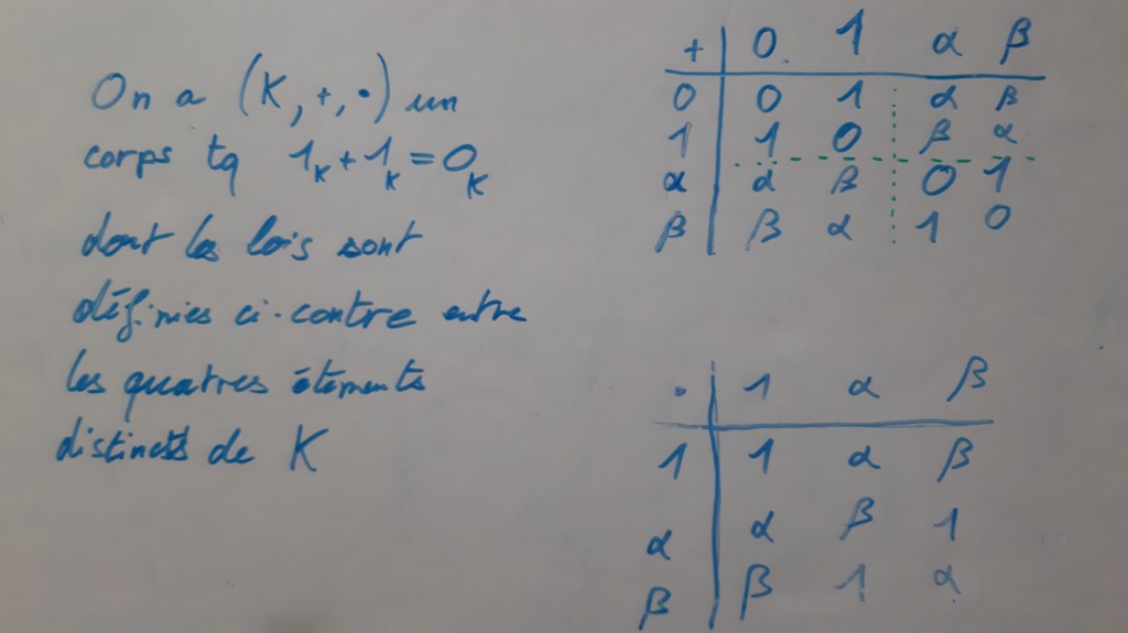 Gabriel a rêvé ce midi d’un corps autre que Z/2Z où 2.1_K=0_K, il a trouvé ainsi la (unique à isomorphisme près) structure de corps sur un ensemble à 4 éléments qu’il appelle 0,1,alpha,beta : il a accepté de vous la partager 🙂
