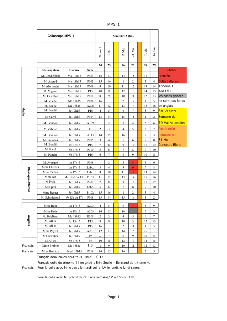 Nouveau colloscope pour la fin d’année : Le voici : notez deux semaines qui sautent l’une avec le jeudi-vendredi du pont de l’ascension, l’autre avec le concours blanc. Vous retrouverez ce fichier sur l’onglet Info Pratique/ Classes concours. Partager : Cliquer pour partager sur X(ouvre dans une nouvelle fenêtre) X Cliquez pour partager sur Facebook(ouvre dans une nouvelle fenêtre) Facebook J’aime chargement… Similaire