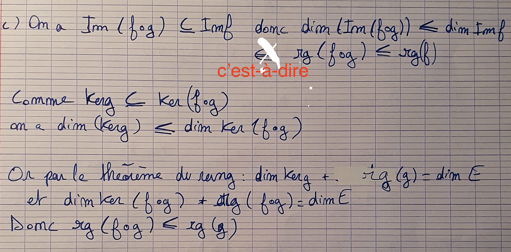 Le d) d’Aline (noter qu’il n’y a pas de vilain => ou <=> mais des « Soit » et des « Donc » ♥️). Peut-être juste avant le « donc avec a) » de la dernière phrase dire qu’on vient de prouver que Ker(f o g) est inclus dans Ker g