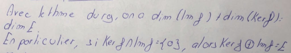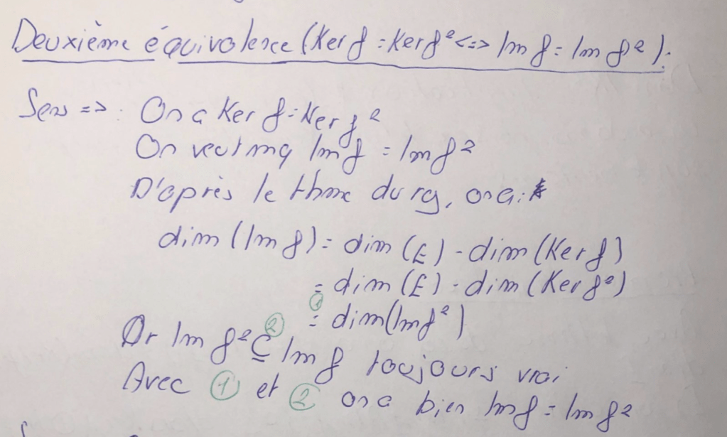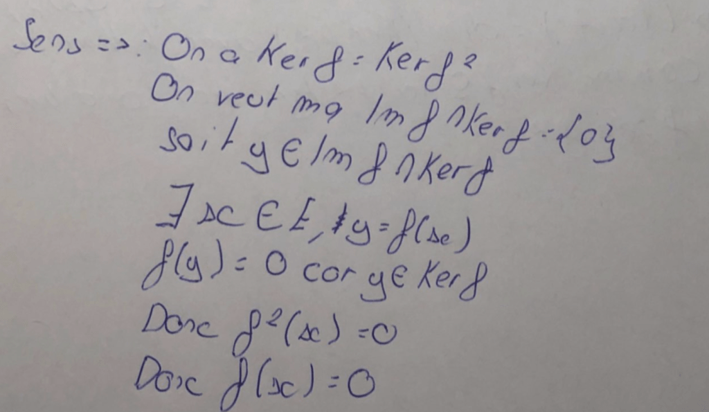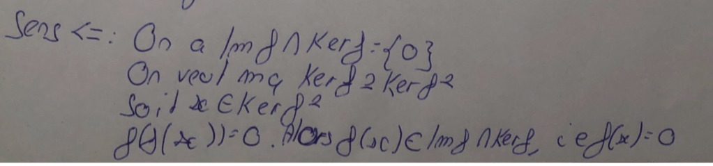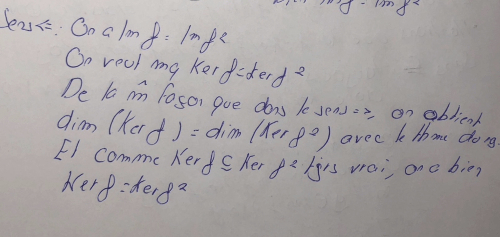 Donc x est dans Ker f, ce qui donne bien l’inclusion de Ker f^2 dans Ker f et l’autre inclusion est toujours vraie (le dire, Némo l’a dit dans une remarque préliminaire non reproduite ici).