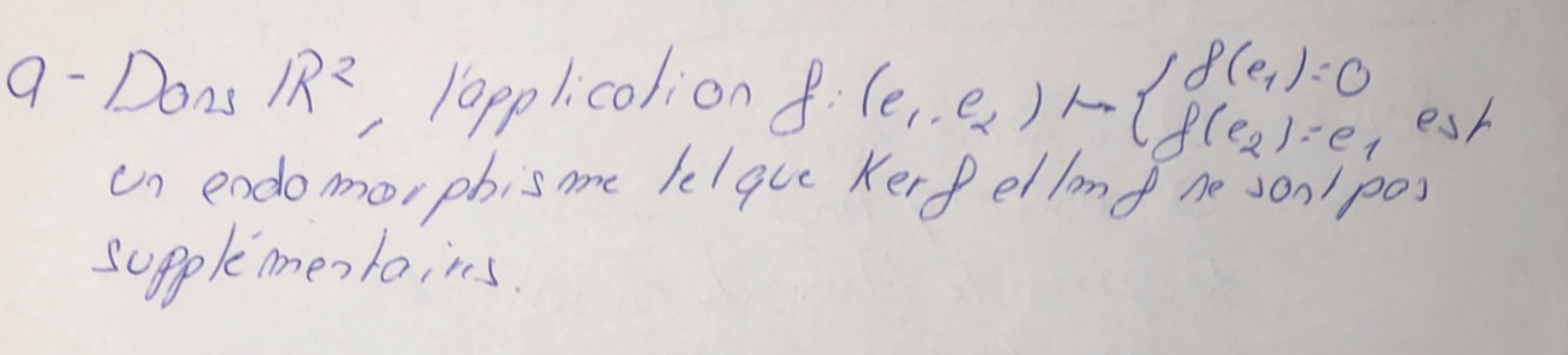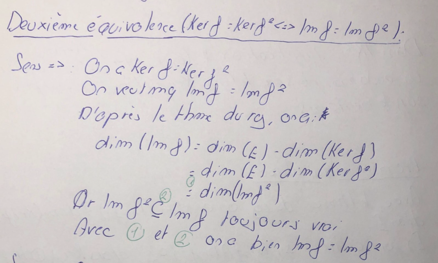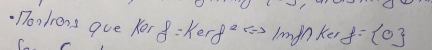 Donc x est dans Ker f, ce qui donne bien l’inclusion de Ker f^2 dans Ker f et l’autre inclusion est toujours vraie (le dire, Némo l’a dit dans une remarque préliminaire non reproduite ici).