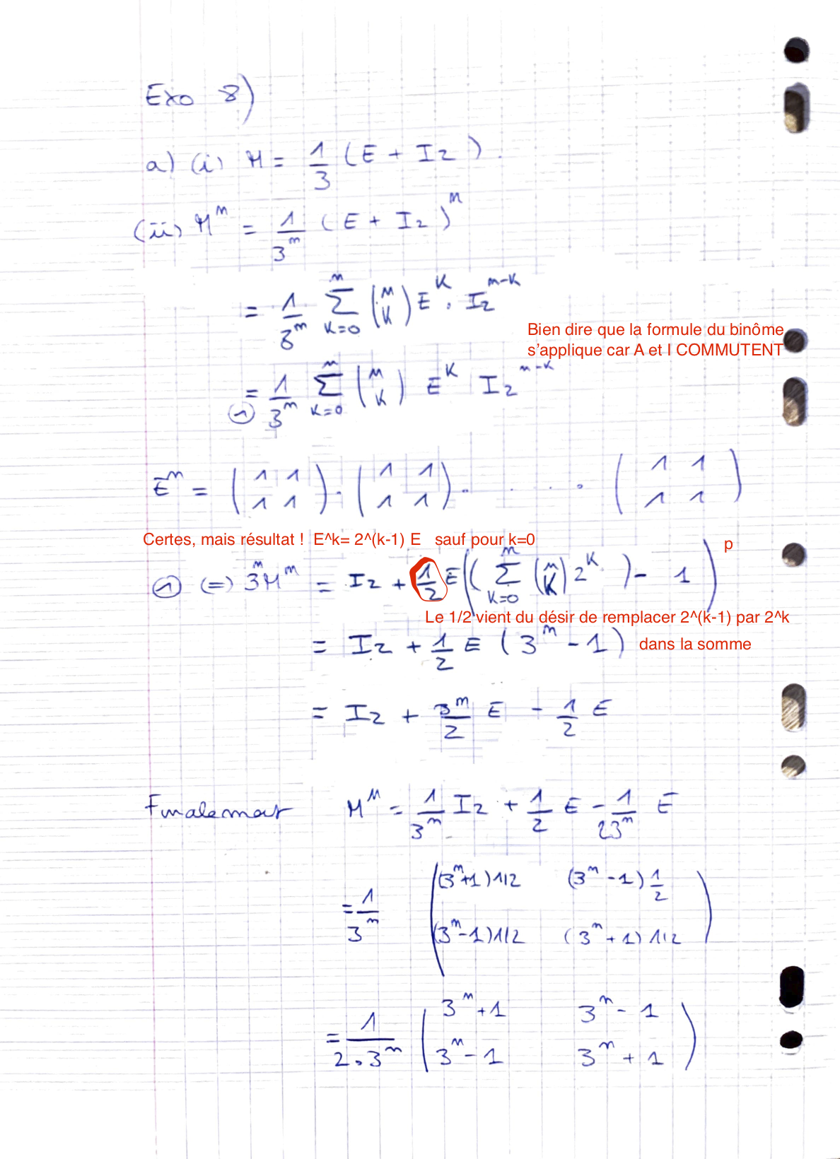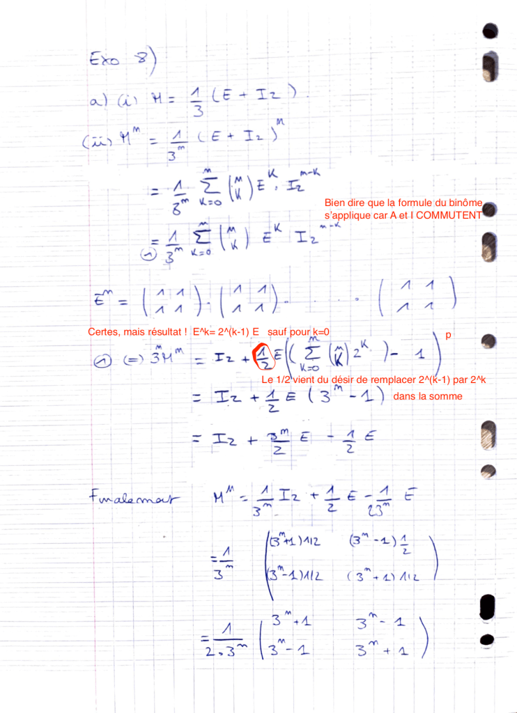 A la fin de l’article sur l’ex. 4. je parle de l’intérêt de la formule du binôme (A+B)^n pour deux matrice A et B qui COMMUTENT… (avec A=I).