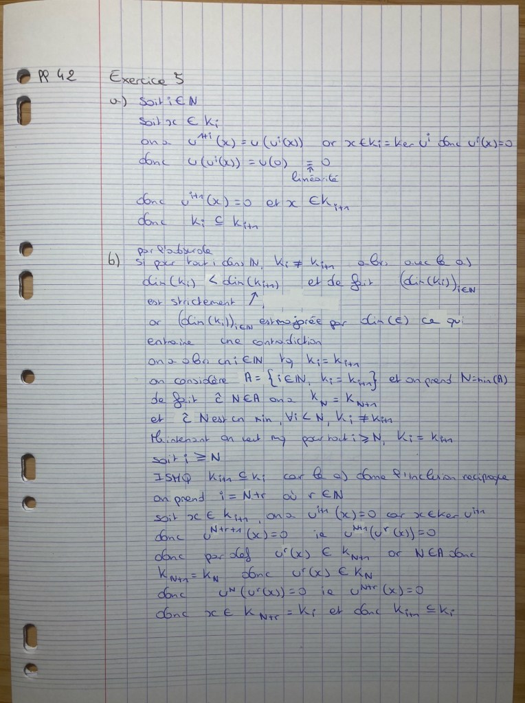 Bonus : on peut montrer, mieux, ce n’était pas dans l’énoncé de l’exercice, mais c’est aussi un résultat important au niveau supérieur pour cette théorie, que la suite des noyaux « s’essouffle » c’est-à-dire fait des pas de plus en plus petit, précisément que la suite des dim Ker u^{i+1}-dim Ker u^i est décroissante. (Attention, vous l’aurez sûrement en colle pour certains à la rentrée :-). Remarquer aussi que ce résultat d’essoufflement donne aussi le sens « difficile » de l’exercice 6 donc cela peut être rentable pour d’autres exercices. 🤗