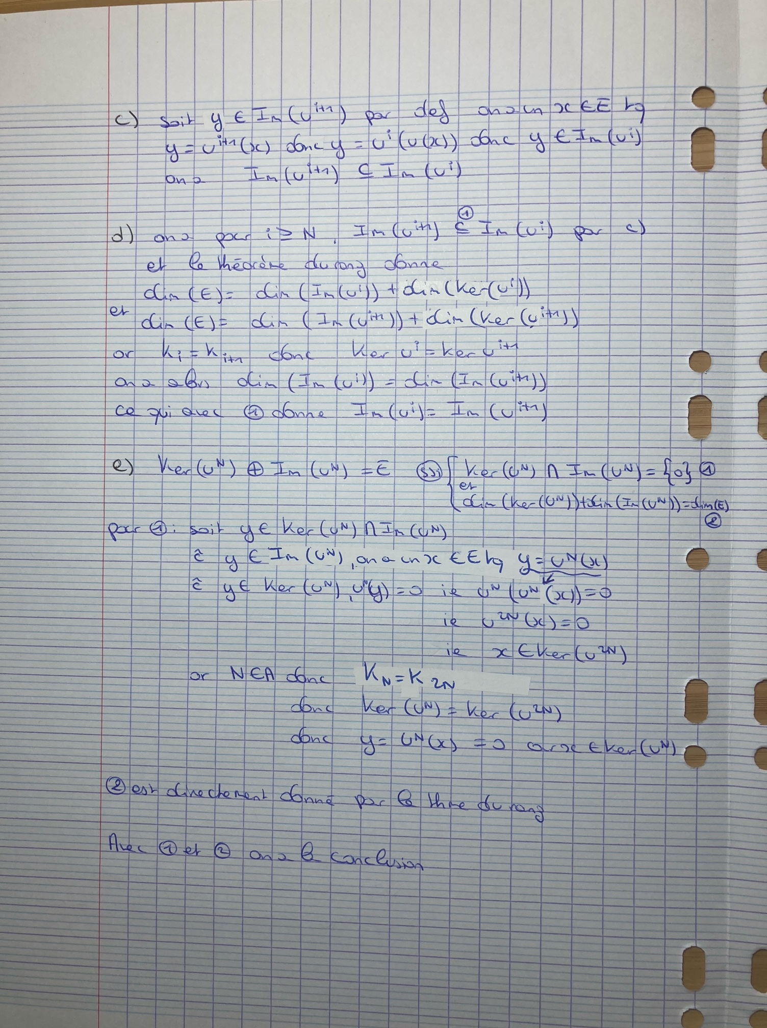 Bonus : on peut montrer, mieux, ce n’était pas dans l’énoncé de l’exercice, mais c’est aussi un résultat important au niveau supérieur pour cette théorie, que la suite des noyaux « s’essouffle » c’est-à-dire fait des pas de plus en plus petit, précisément que la suite des dim Ker u^{i+1}-dim Ker u^i est décroissante. (Attention, vous l’aurez sûrement en colle pour certains à la rentrée :-). Remarquer aussi que ce résultat d’essoufflement donne aussi le sens « difficile » de l’exercice 6 donc cela peut être rentable pour d’autres exercices. 🤗