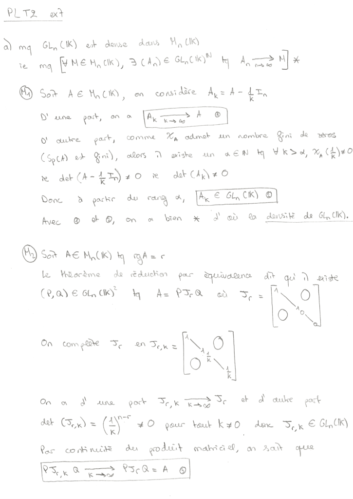 Donc pour les colles de la semaine de la rentrée toute la planche T2 actuelle sauf ex 7b) et 9b). Voici donc le 7 a) par Arthur, noter qu’à la fin de la méthode 2 il invoque la continuité du produit matriciel dont nous n’avons pas encore parlé sous cette forme, mais nous avons parlé du théorème sur la limite d’un produit de suites donc tout va bien.
